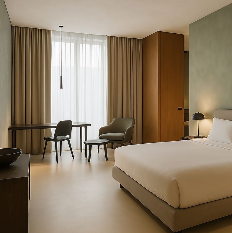 CalceCruda, a refined natural lime plaster enriched with mineral aggregates, offering soft, earthy tones and an organic aesthetic that brings warmth and authenticity to interior spaces.